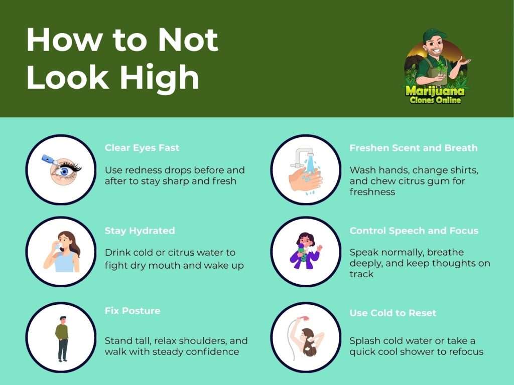 So, to avoid looking high, stay hydrated, use eye drops for red eyes, fix your posture, and avoid overacting. Wash up, control your speech, and stay mentally grounded with cold water or citrus snacks. These quick fixes keep you discreet after consuming cannabis.
