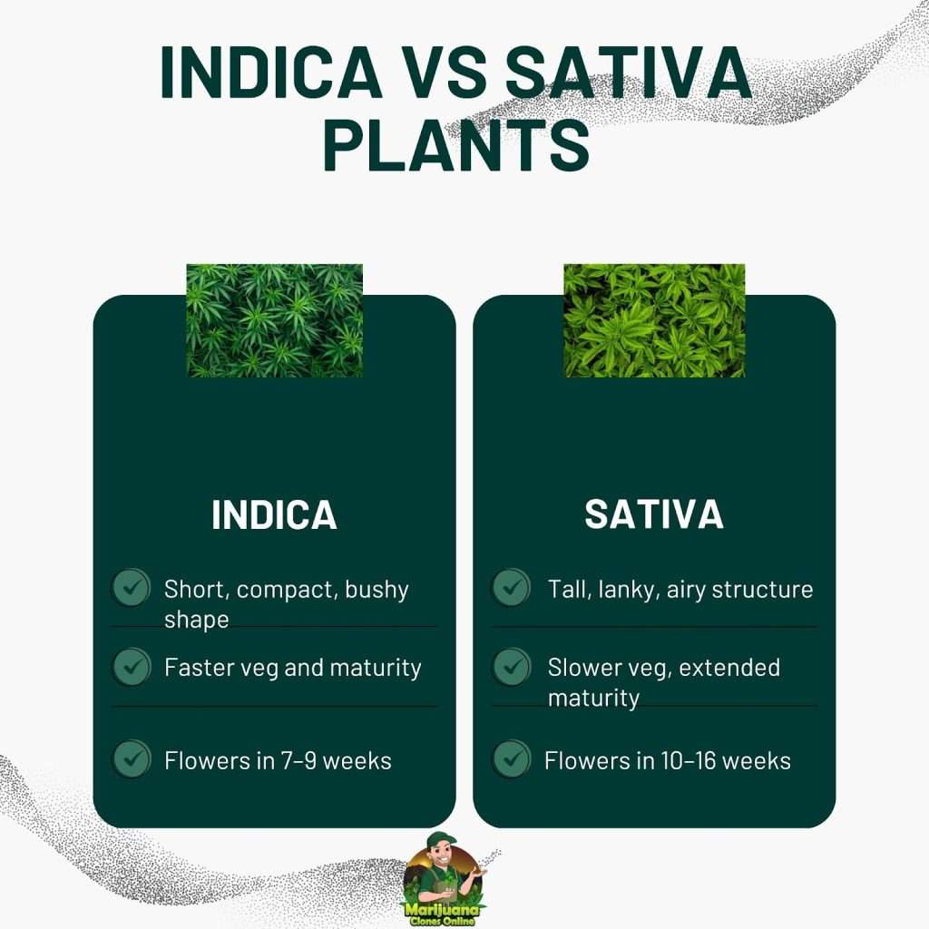What matters most is how each plant grows. Sativa varieties tend to stretch vertically, requiring more space and a longer flowering period. Indica varieties stay compact and bushy, with shorter internodes and a faster path to harvest. These traits influence everything from canopy control to nutrient uptake and trimming workload.